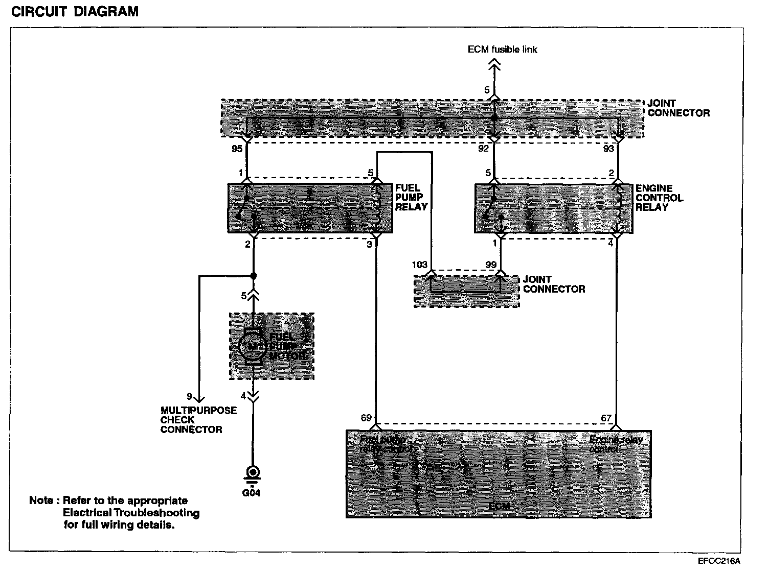 MFI CONTROL RELAYWhen the ignition switch is on, battery power is supplied to the ECM, the injectors, the mass air flow sensor, etc. While the ignition switch is turned on, current flows from the ignition switch through the current relay coil to ground.