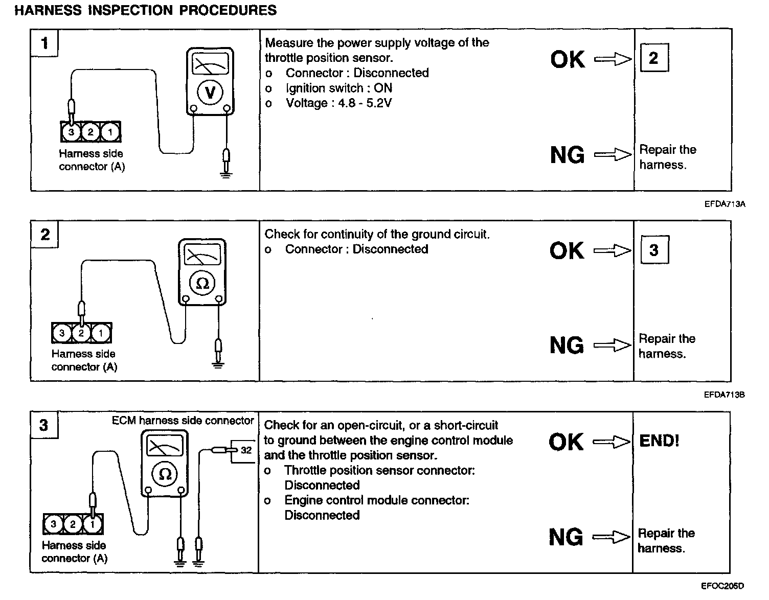 3. Input voltage from throttle position sensor is below 0.1 V or above 4.7 V when ignition switch is turned on.