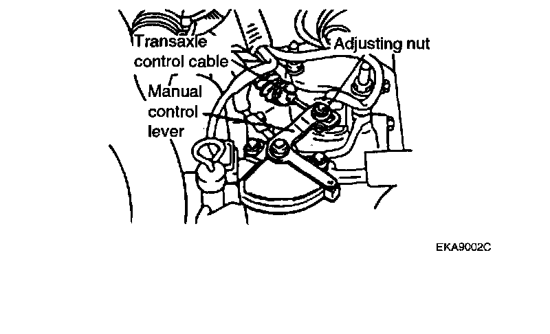 6. Gently pull the transaxle control cable in the direction of the arrow, then tighten the adjusting nut.