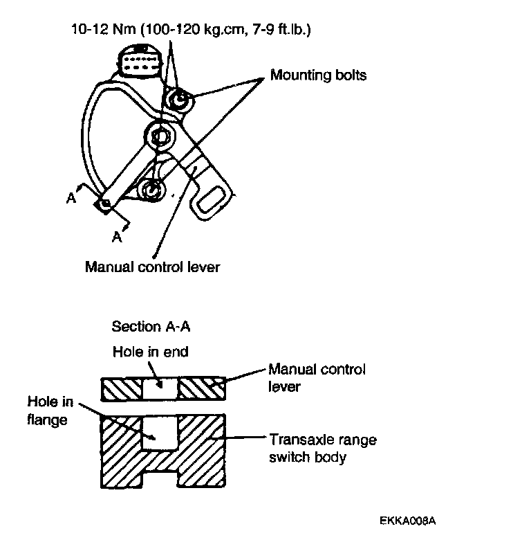 4. Loosen the transaxle range switch body mounting bolts and then turn the transaxle range switch body so the hole in the end of the manual control lever and the hole (cross section A-A in the figure) in the flange of the transaxle range switch body flange are aligned.