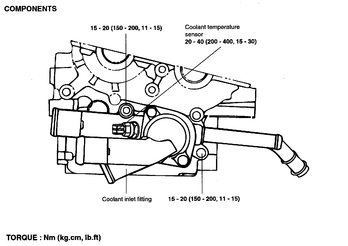 Coolant inlet fitting nuts......15-20 Nm (150-200 kg-cm, 11-14 ft. lbs.)
