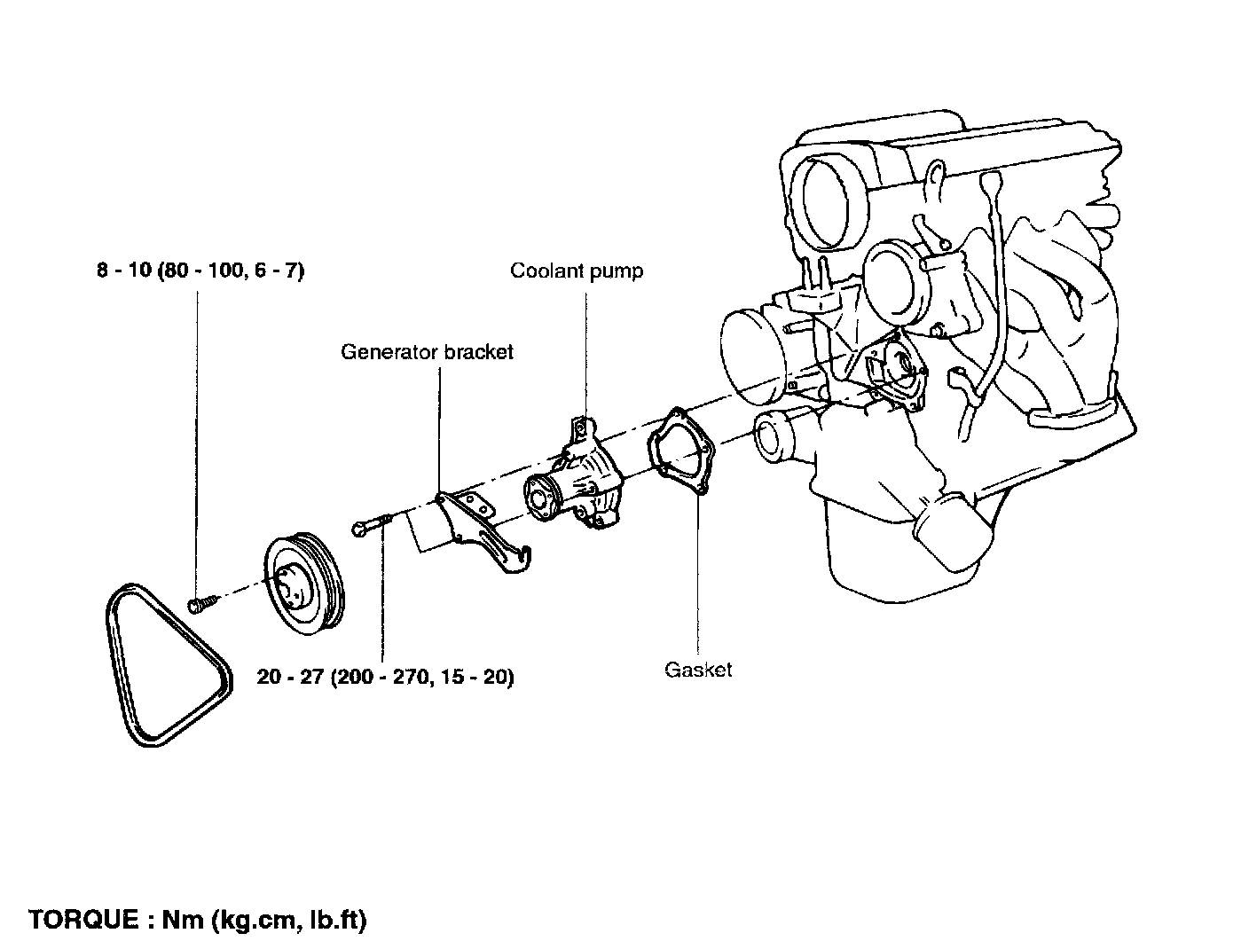 Coolant pump bolts 20-27 Nm (200-270 kg-cm, 14-19 ft. lbs.)