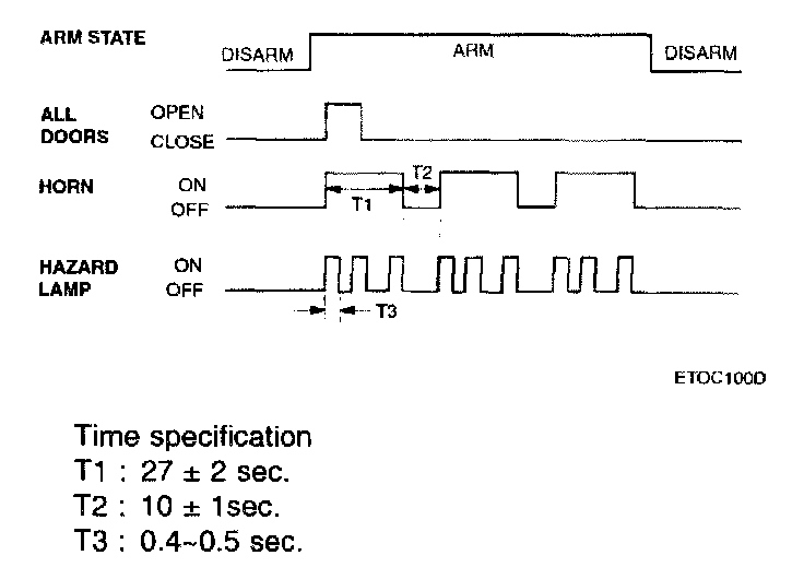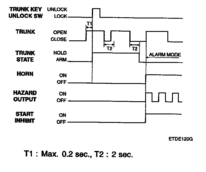 1. In case of opening the trunk by trunk unlock switch during arm state, the alarming is hold. When received transmitter (TX) trunk signal in arm state, trunk open by output trunk lid open relay signal for 500 ms and then holding alarm. But the door and hood except trunk is still in the arm state.