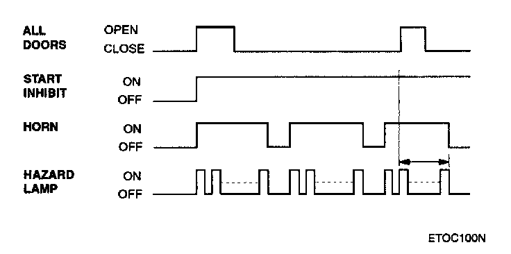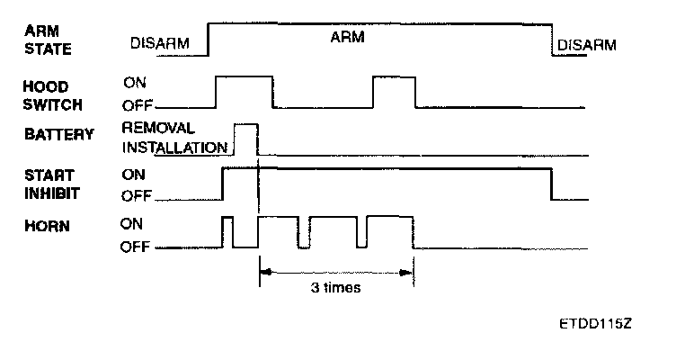This system enters the armed state if it is in the prearmed state and, after 0.6 sec, check actuator lock and each door, hood and tail gate close, and no door warning switch (no key in ignition).
