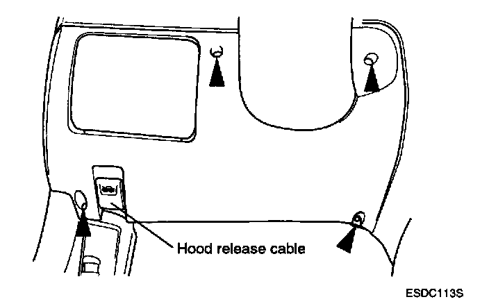 3. Disconnect the hood release cable and the data link connector from beneath the driver's crash pad lower panel.