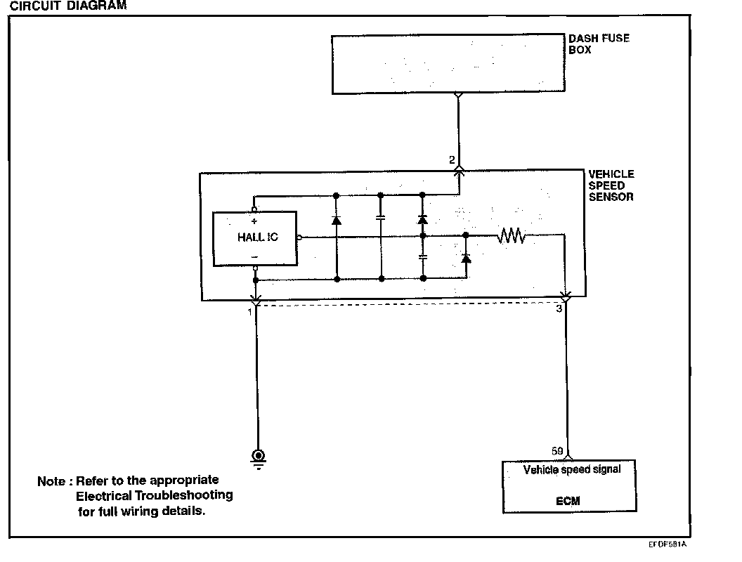 The vehicle speed sensor is a hall effect sensor that is attached on the output shaft of transaxle. The sensor converts the transaxle gear revolutions into a pulse signal which is sent to the ECM.