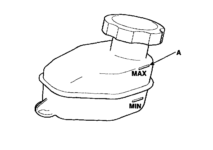 1. Make sure the brake fluid level in the reservoir is at the MAX (upper) level line (A).