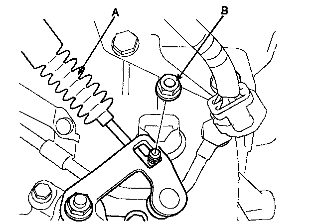 7. Remove the control cable to transaxle range switch (A) mounting nut (B).