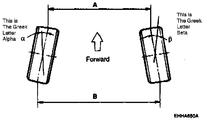 Toe-in (B-A or angle alpha + beta) is adjusted by turning the tie rod turnbuckles. Toe-in on the left front wheel can be reduced by turning the tie rod toward the rear of the car. Toe-in change is adjusted by turning the tie rod for the right and left wheels simultaneously at the same amount as follows: