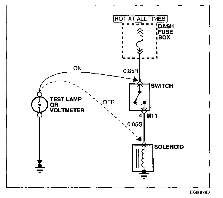 a. Connect one lead of a test lamp or voltmeter to a ground. If you are using a voltmeter, be sure it is the voltmeter's negative test lead you have connected to ground.