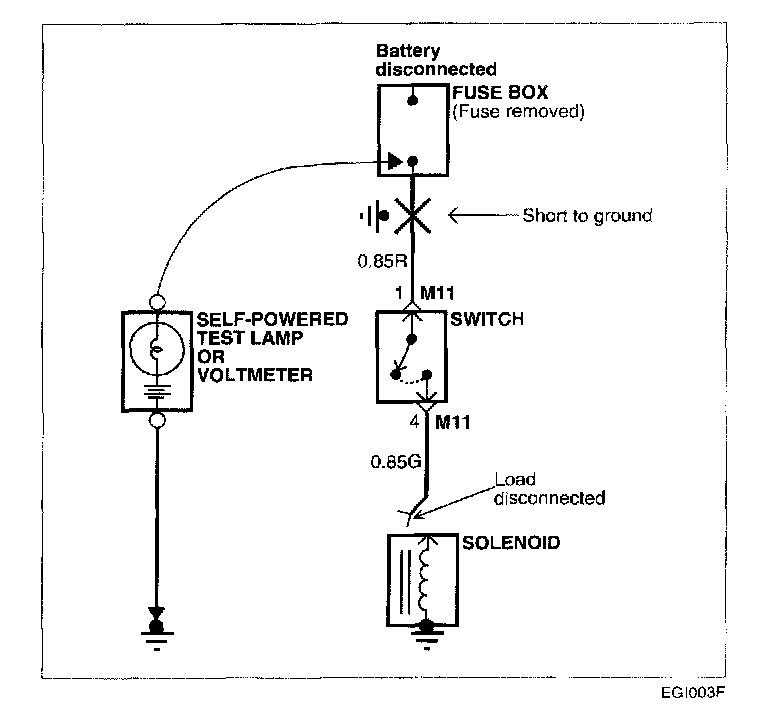 e. When the self-powered test lamp glows, or ohmmeter registers, there is a short to a ground in the wiring near that point.