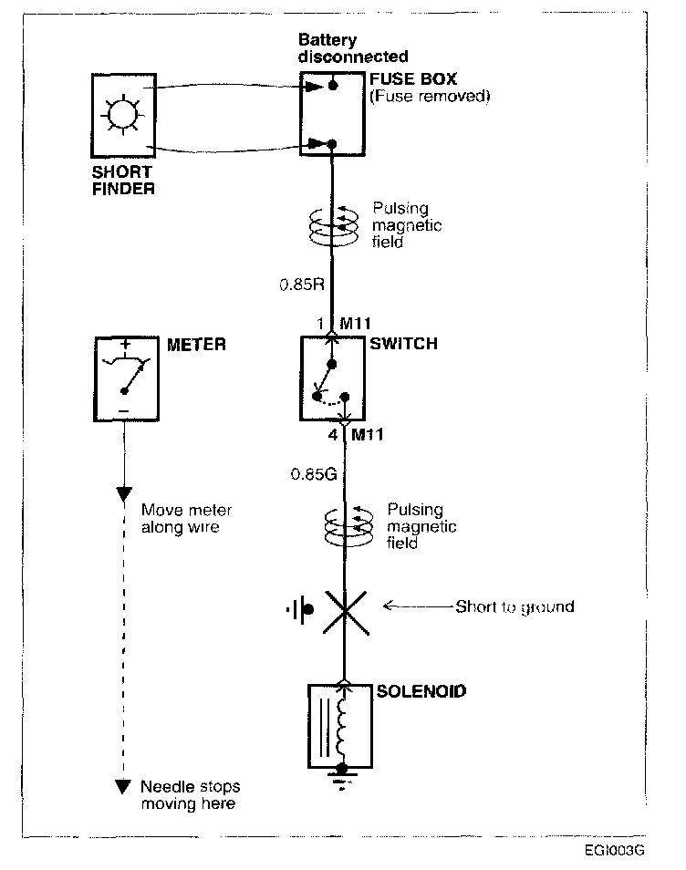 e. Beginning at the fuse box, slowly move the short finder along the circuit wiring. The meter will show current pulses through sheet metal and body trim. As long as the meter is between the fuse and the short. the needle will move with each current pulse. Once the meter is moved past the point of the short, the needle will stop moving. Check around this area to locate the cause of the short circuit.