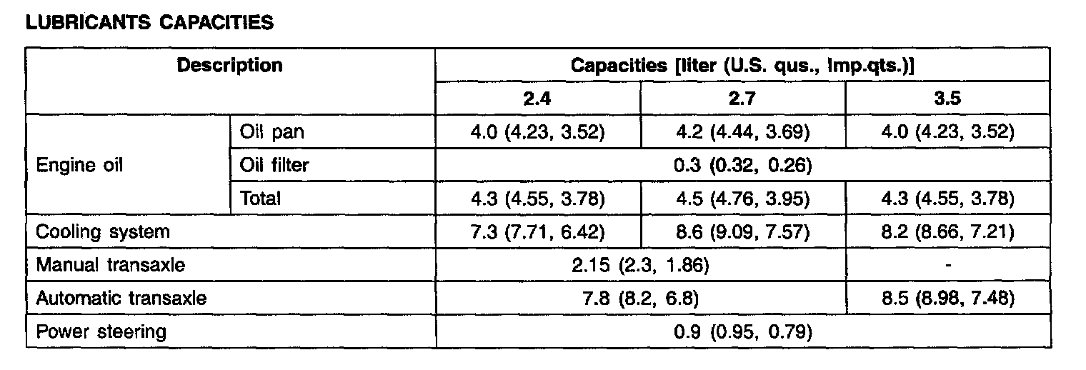 Lubricants Capacities: