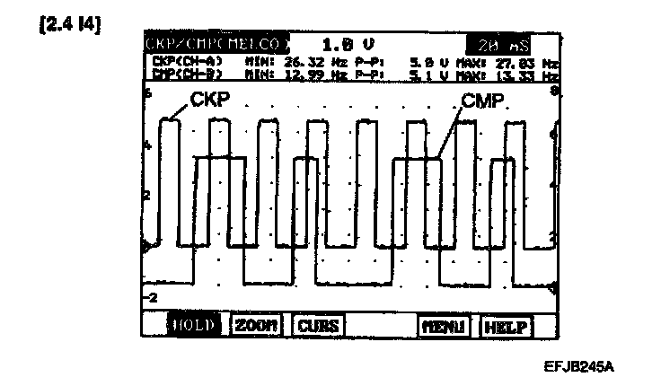 MAJOR SENSOR REFERENCE WAVE-FORMSThe followings are the major sensor reference wave-forms. Below is the data for CMP, Mass Air Flow Sensor, Throttle Position Sensor, Rear O2 Sensor, Front O2 Sensor and Injection Pulse when revving quickly up to 4800 rpm under no-load after warming up engine sufficiently. Each value is for reference, the exact values may vary.