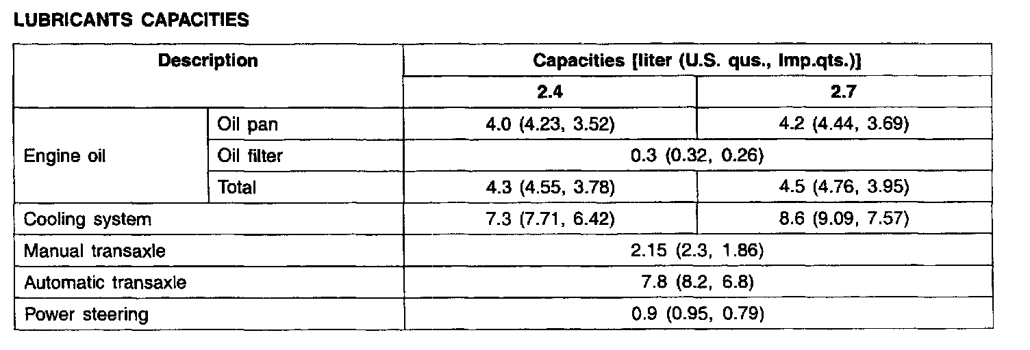 Lubricants Capacities: