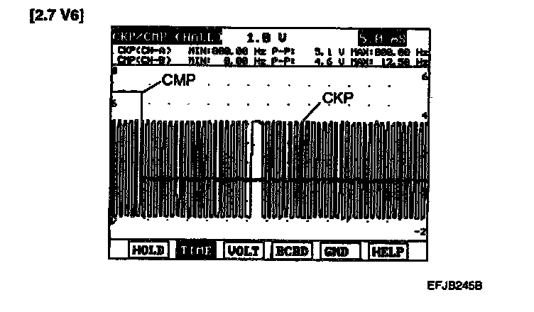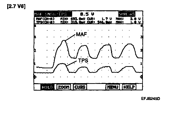 MAJOR SENSOR REFERENCE WAVE-FORMSThe followings are the major sensor reference wave-forms. Below is the data for CMP, Mass Air Flow Sensor, Throttle Position Sensor, Rear O2 Sensor, Front O2 Sensor and Injection Pulse when revving quickly up to 4800 rpm under no-load after warming up engine sufficiently. Each value is for reference, the exact values may vary.