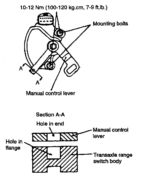 4. Loosen the transaxle range switch body mounting bolts and then turn the transaxle range switch body so the hole in the end of the manual control lever and the hole (cross section A-A in the figured in the flange of the transaxle range switch body flange are aligned.