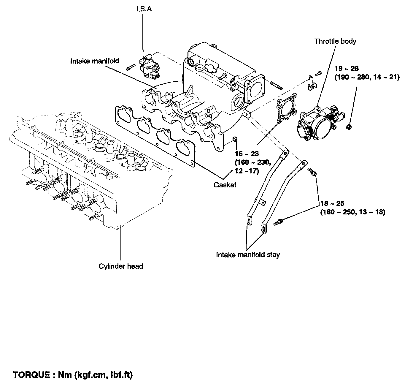 Tightening TorqueIntake manifold to cylinder head nuts and bolts 16 - 23 Nm (12 - 17 ft. lbs.)