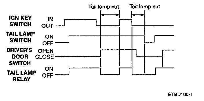 2. With the ignition key switch ON, if the driver's door is opened and the ignition key switch is OFF, the tail lamp should be automatically OFF