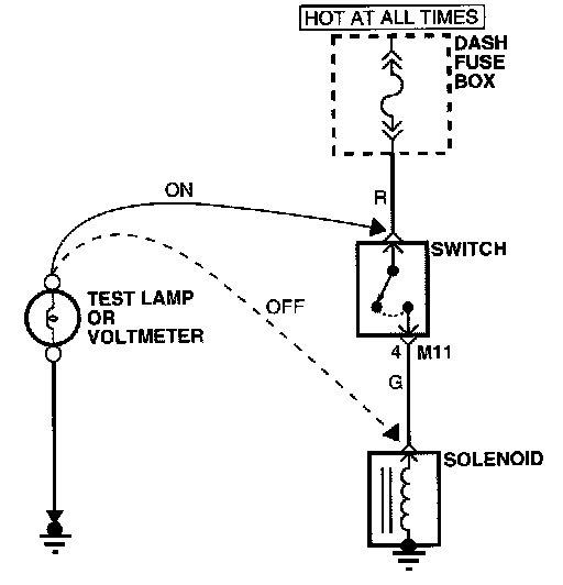 A. Connect one lead of a test lamp or voltmeter to a ground. If you are using a voltmeter, be sure it is the voltmeter's negative test lead you have connected to ground.