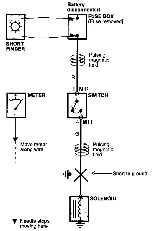 A short finder is available to locate a short to ground. The short finder creates a pulsing magnetic field in the shorted circuit and shows you the location of the short through body trim or sheet metal.