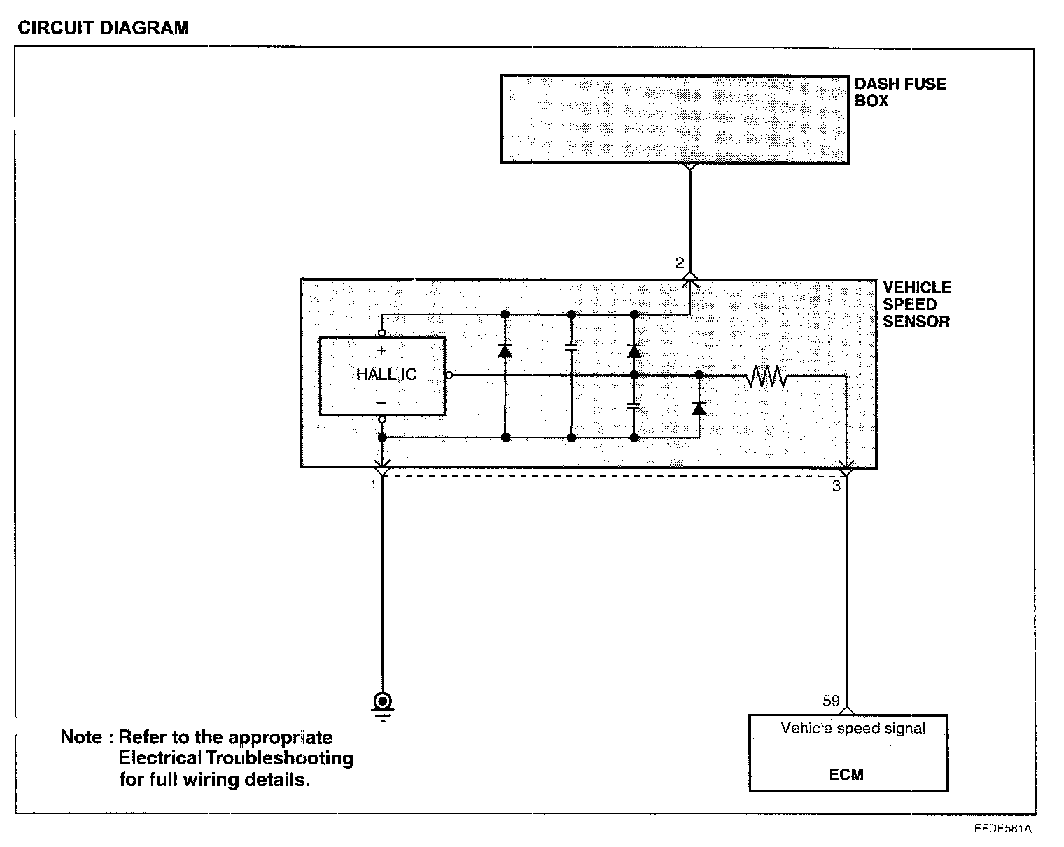 The vehicle speed sensor is a hall effect sensor that is attached on the output shaft of transaxle. The sensor converts the transaxle gear revolutions into a pulse signal which is sent to the ECM.