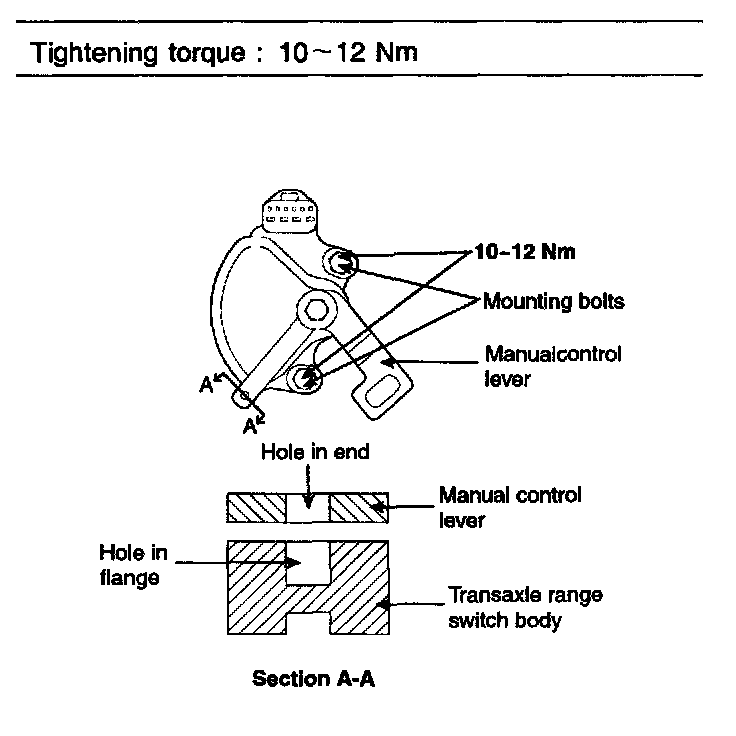 4. Loosen the transaxle range switch body mounting bolts and then turn the transaxle range switch body so the hole in the end of the manual control lever and the hole (cross section A-A in the figure) in the flange of the transaxle range switch body flange are aligned.