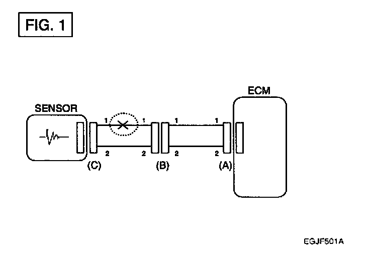 If an open circuit occurs (as seen in [FIG. 1]), it can be found by performing Step 2 (Continuity Check Method) or Step 3 (Voltage Check Method) as shown below.
