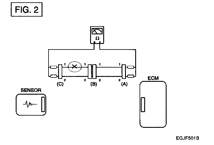 b. Disconnect connector (B), and measure for resistance between connector (C) and (B1) and between (B2) and (A) as shown in [FIG. 3].