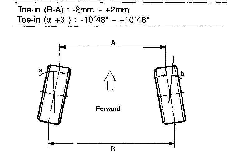 Toe-in (B-A or angle a+b) is adjusted by turning the tie rod turnbuckles. Toe in on the left front wheel can be reduced by turning the tie rod toward the rear of the car. Toe change is achieved by turning the tie for the right and left wheels simultaneously the same amount as follows: