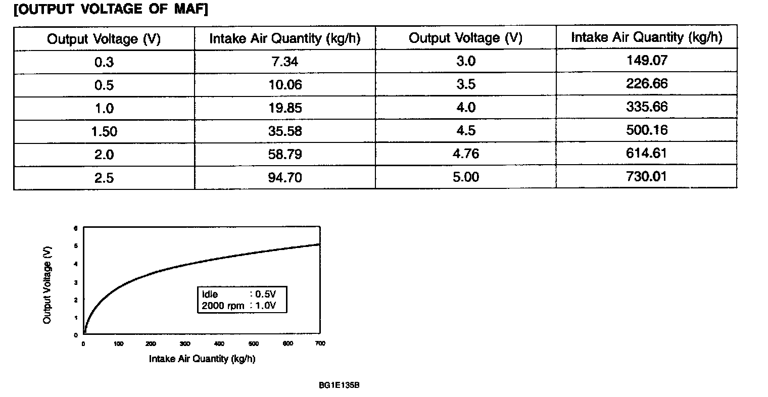 3. If the engine can idle even if the MAF sensor output voltage is out of specification, check for the following conditions;