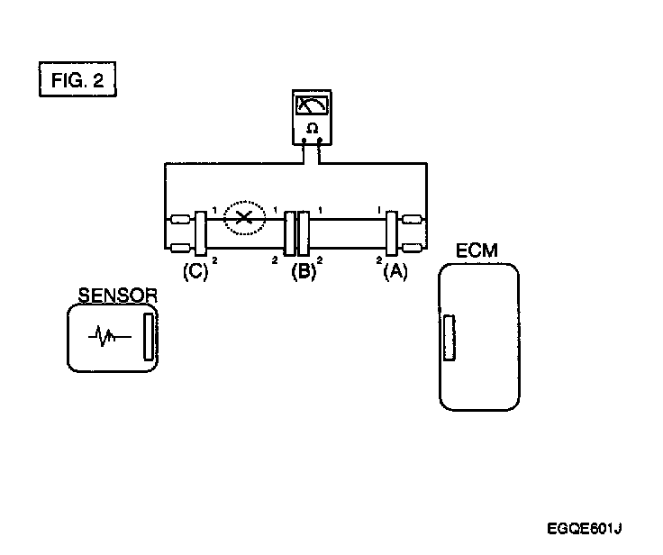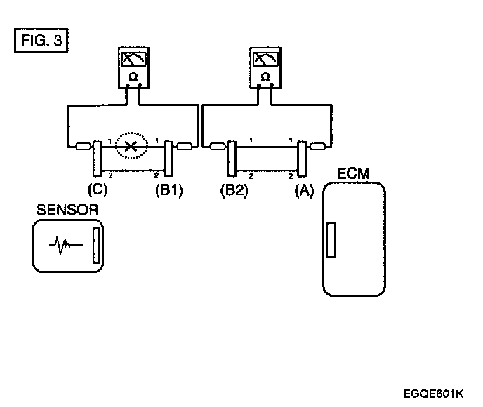 b. Disconnect connector (B), and measure for resistance between connector (C) and (B1) and between (B2) and (A) as shown in [FIG. 3].