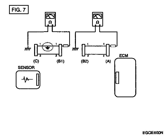 b. Disconnect connector (B), and measure the resistance between connector (A) and chassis ground, and between (B1) and chassis ground as shown in [FIG.7].