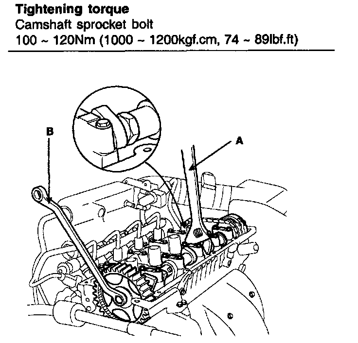 Hold the hexagonal head wrench (A) portion of the camshaft with a wrench (B), and tighten the camshaft sprocket (C) bolt.