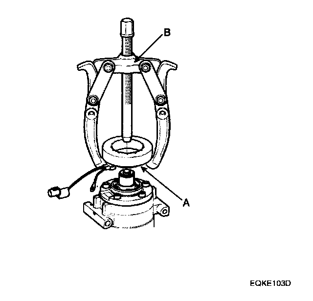 4. Remove the screw from the field coil ground terminal. Remove the field coil (A) from the shaft with a puller (B). Be careful not to damage the coil and compressor.