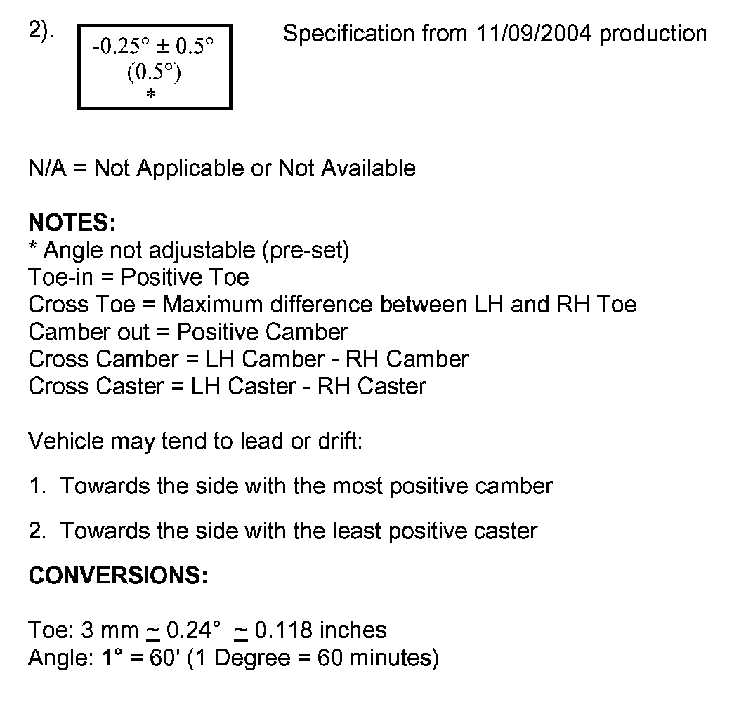 2005 MODEL YEAR ALIGNMENT SPECIFICATIONS CHART: