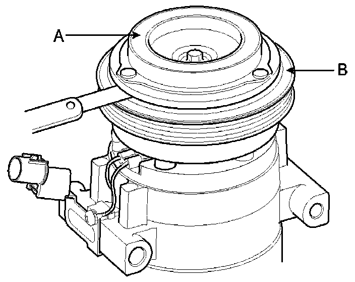 3. Measure the clearance between the pulley (B) and the disc& hub assembly (A) all the way around. If the clearance is not within specified limits, remove the disc& hub assembly and add or remove shim (gap washer) as needed to increase or decrease clearance.