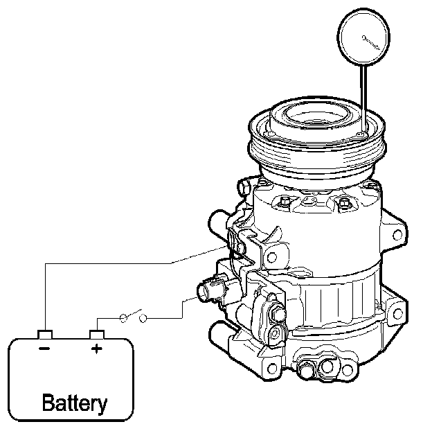 4. Check operation of the magnetic clutch. Connect the compressor side terminals to the battery (+) terminal and the ground battery (-) terminal to the compressor body. Check the magnetic clutch operating noise to determine the condition.