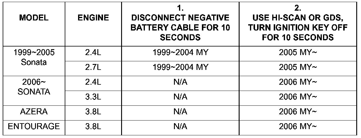 Adaptive values must be reset using procedure # 1 or # 2 according to model and model year (MY) as shown below.