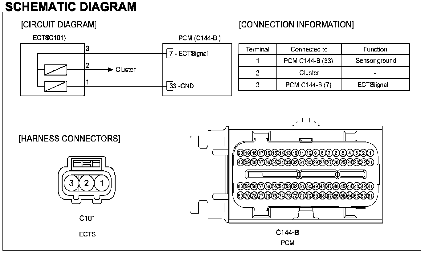 Engine Coolant Temperature Sensor (ECTS) is located in the engine coolant passage of the cylinder head for detecting the engine coolant temperature. The ECTS uses a thermistor whose resistance changes with the temperature. The electrical resistance of the ECTS decreases as the temperature increases, and increases as the temperature decreases. The reference 5 V in the PCM is supplied to the ECTS via a resistor in the PCM.That is, the resistor in the PCM and the thermistor in the ECTS are connected in series. When the resistance value of the thermistor in the ECTS changes according to the engine coolant temperature, the output voltage also changes. During cold engine operation the PCM increases the fuel injection duration and controls the ignition timing using the information of engine coolant temperature to avoid engine stalling and improve driveablity.