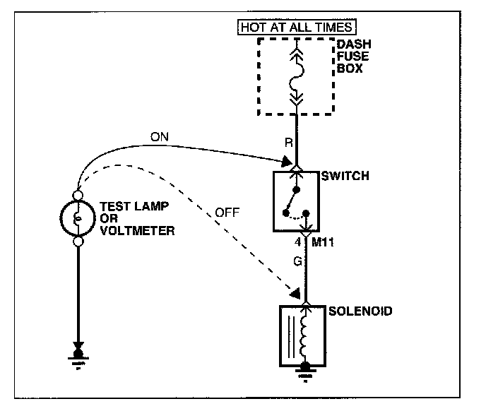 A. Connect one lead of a test lamp or voltmeter to a ground. If you are using a voltmeter, be sure it is the voltmeter's negative test lead you have connected to ground.