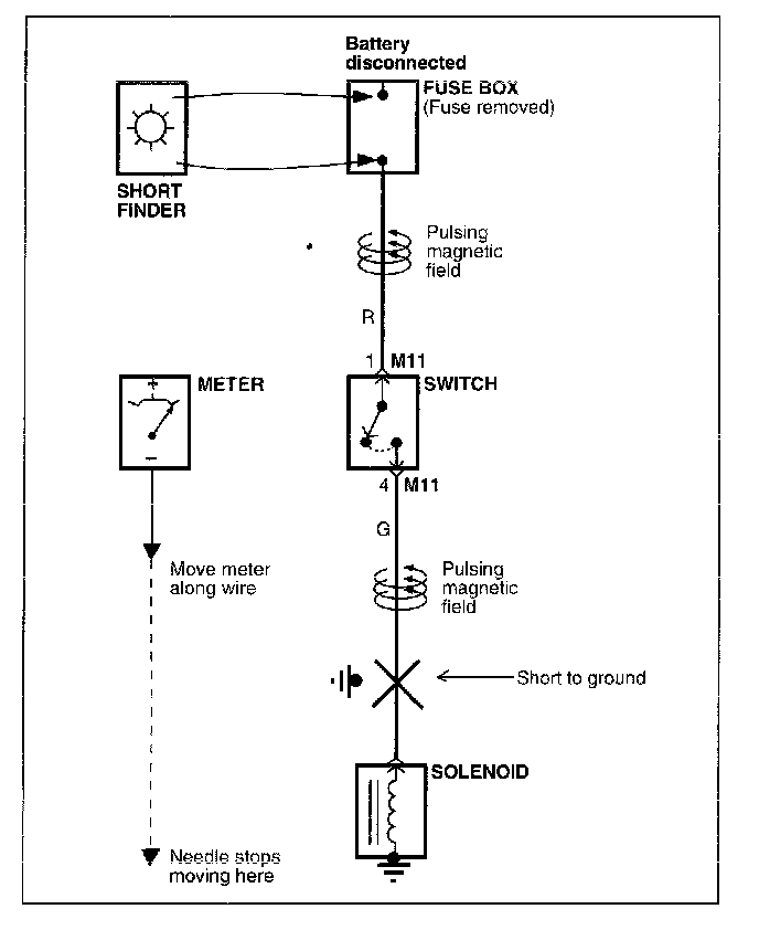 A short finder is available to locate a short to ground. The short tinder creates a pulsing magnetic field in the shorted circuit and shows you the location of the short through body trim or sheet metal.