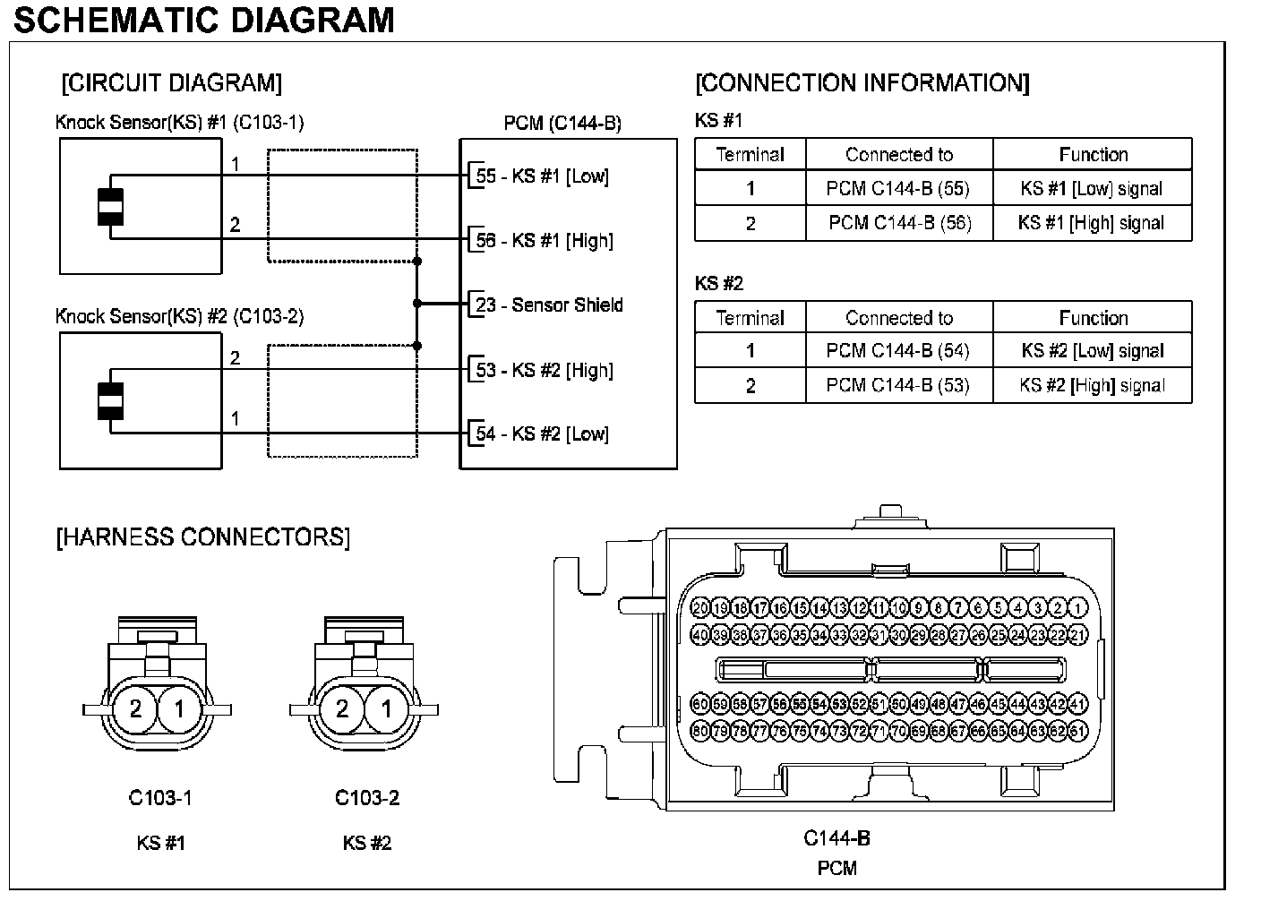 Knocking is a phenomenon characterized by undesirable vibration and noise and can cause engine damage. Knock Sensor (KS) senses engine knocking and the two sensors are installed inside the V-valley of the cylinder block. When knocking occurs, the vibration from the cylinder block is applied as pressure to the piezoelectric element. At this time, this sensor transfers the voltage signal higher than the specified value to the PCM and the PCM retards the ignition timing. If the knocking disappears after retarding the ignition timing, the PCM will advance the ignition timing. This sequential control can improve engine power, torque and fuel economy.
