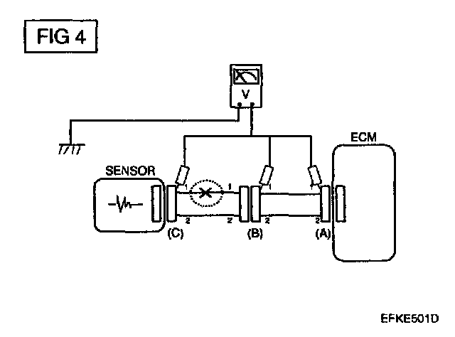 a. With each connector still connected, measure the voltage between the chassis ground and terminal 1 of each connectors (A), (B) and (C) as shown in [FIG. 4].