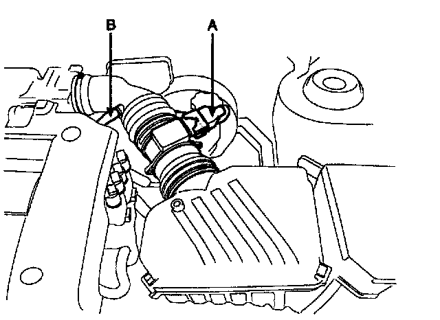 4. Disconnect the air flow sensor connector (A) and breather hose (B).