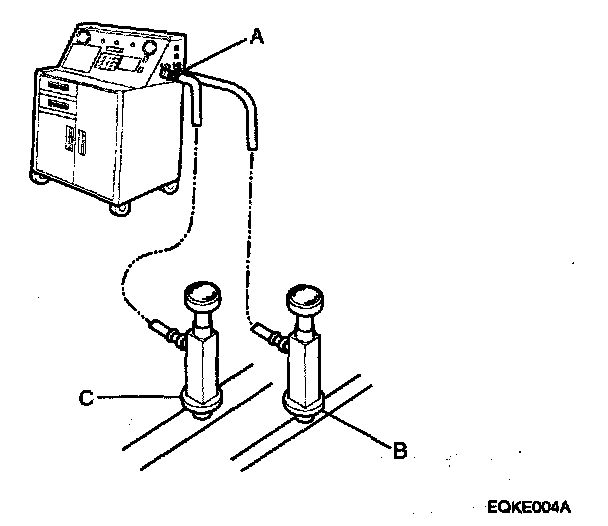 1. Connect a R-134a refrigerant recover/recycling/charging station(A) to the high-pressure service port(B) and the low-pressure service port(C), as shown, following the equipment manufacture s instructions.