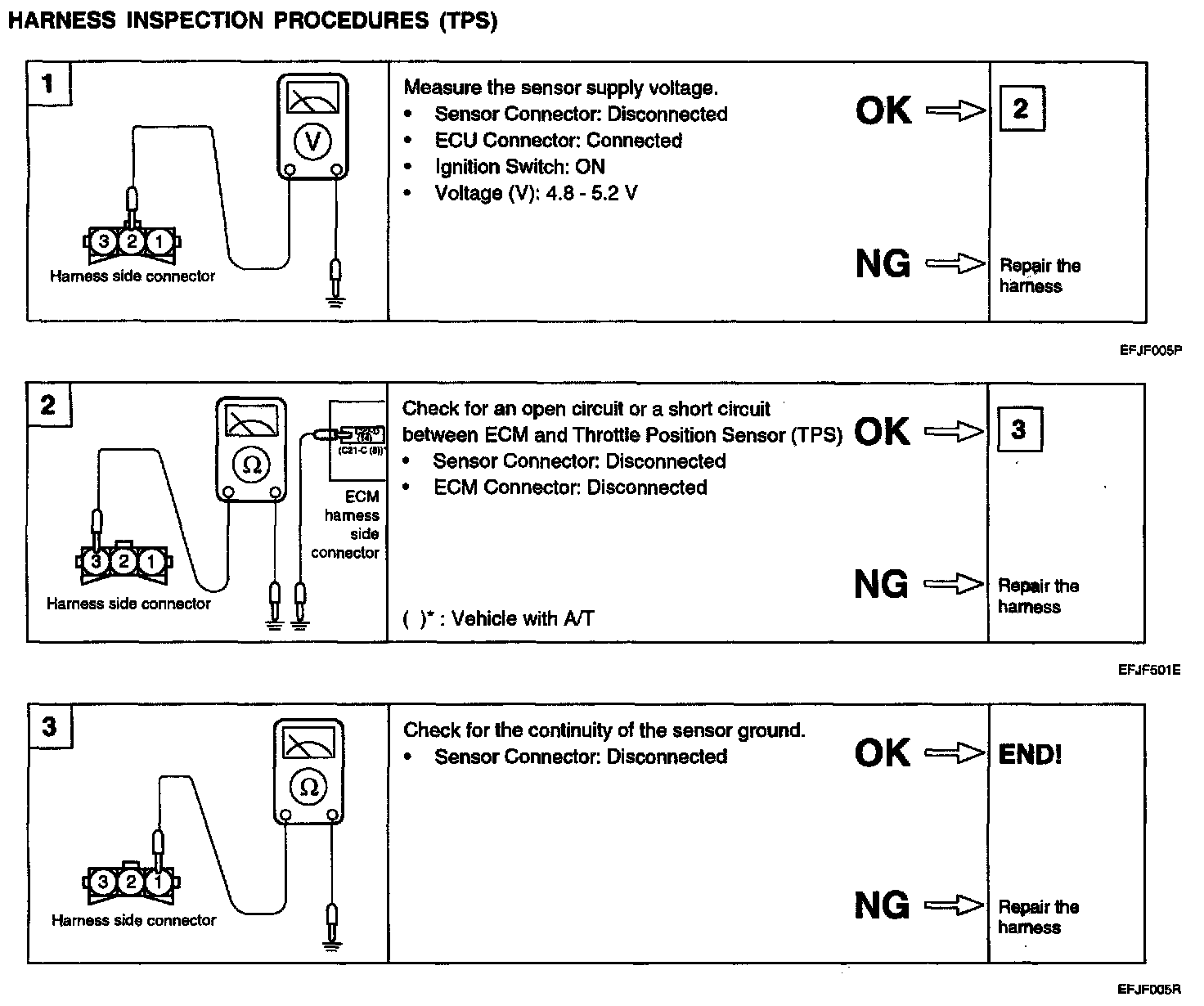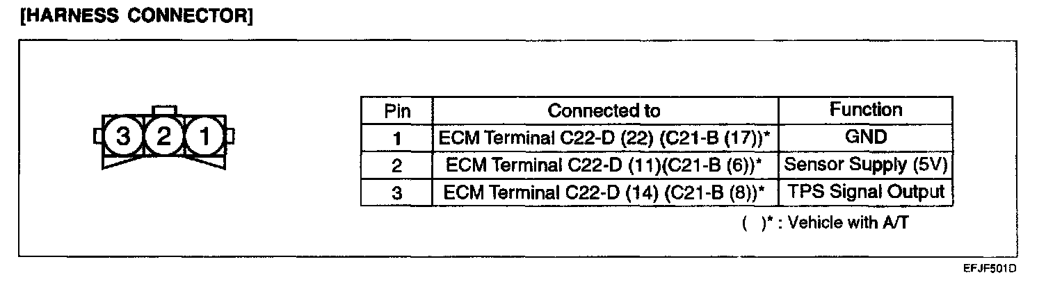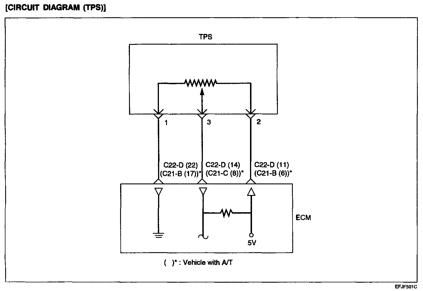 THROTTLE POSITION SENSOR (TPS)The TPS is a variable resistor type that rotates with the throttle body throttle shaft to sense the throttle valve angle. As the throttle shaft rotates, the output voltage of the TPS changes. The ECM detects the throttle valve opening based on voltage change.