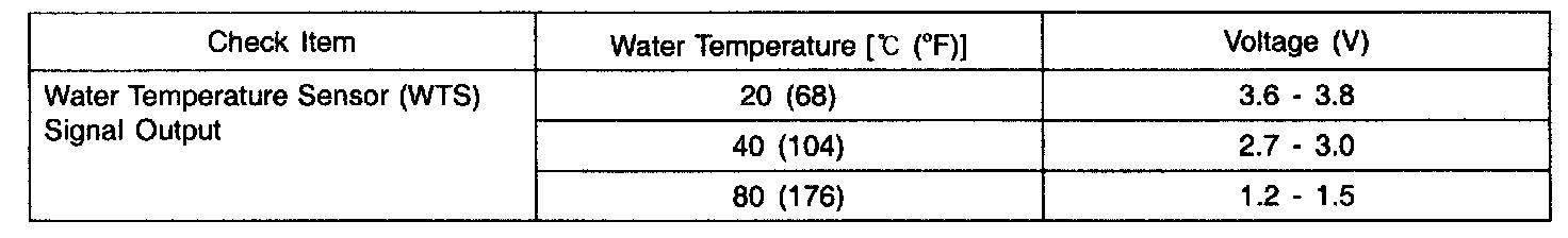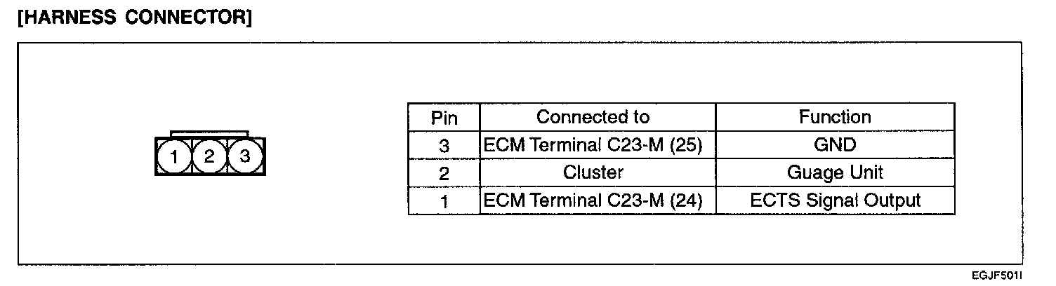 Engine Coolant Temperature Sensor (ECTS) installed in the engine coolant passage of the cylinder head detects the engine coolant temperature and emits signals to the ECM. This part employs a thermistor which is sensitive to changes in temperature. The electric resistance of the thermistor decreases in response to a temperature rise (NTC) The ECM determines engine coolant temperature by the sensor output voltage and provides optimum fuel enrichment when the engine is cold.