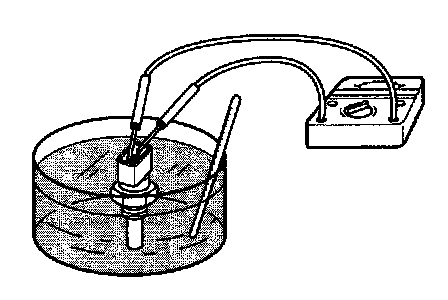 2. With the temperature sensing portion of ECTS immersed in hot engine coolant, check the resistance.