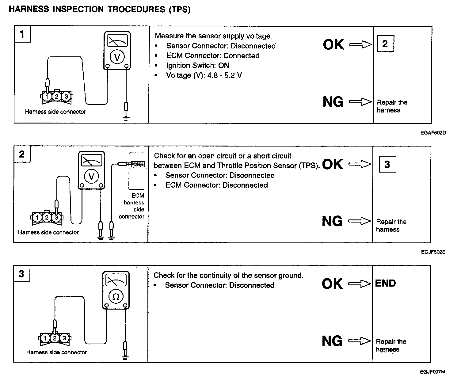 The TPS is a variable resistor type that rotates with the throttle body throttle shaft to sense the throttle valve angle. As the throttle shaft rotates, the output voltage of the TPS changes. The ECM detects the throttle valve opening based on voltage change.
